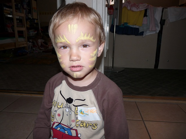És itt van az éppen durcás Gergő kisoroszlán. A nóziját és a bajuszkáit már az 1. pillanattól kezdve a ruhájára biggyesztette: